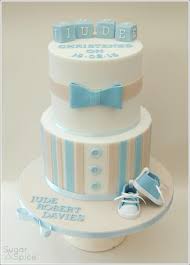 A white 2-tier cake featuring edible fondant alphabet blocks, baby sneakers, blue and tan stripes, and a bow tie.