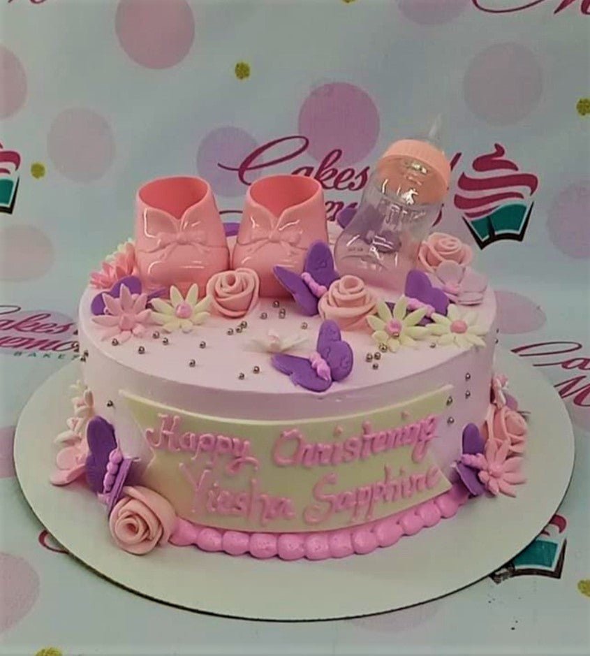 Pink christening cake for Yiesha Sapphire with baby shoes, a feeding bottle, and purple butterflies.