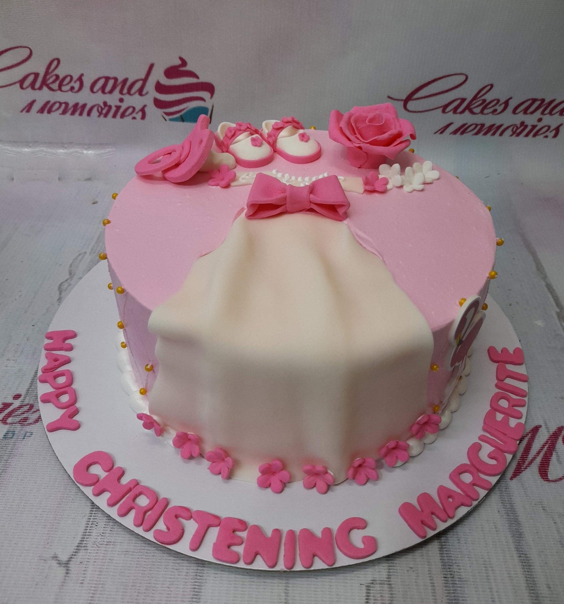 Pink christening cake for Marguerite featuring a fondant baby dress, shoes, pacifier, and pink roses with gold bead accents.