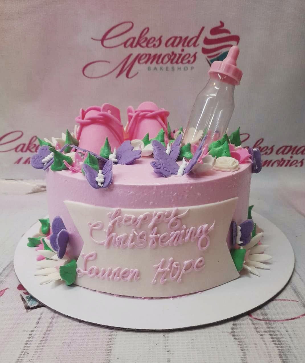 Pink christening cake for Lauren Hope with baby shoes, a bottle, and purple butterflies.