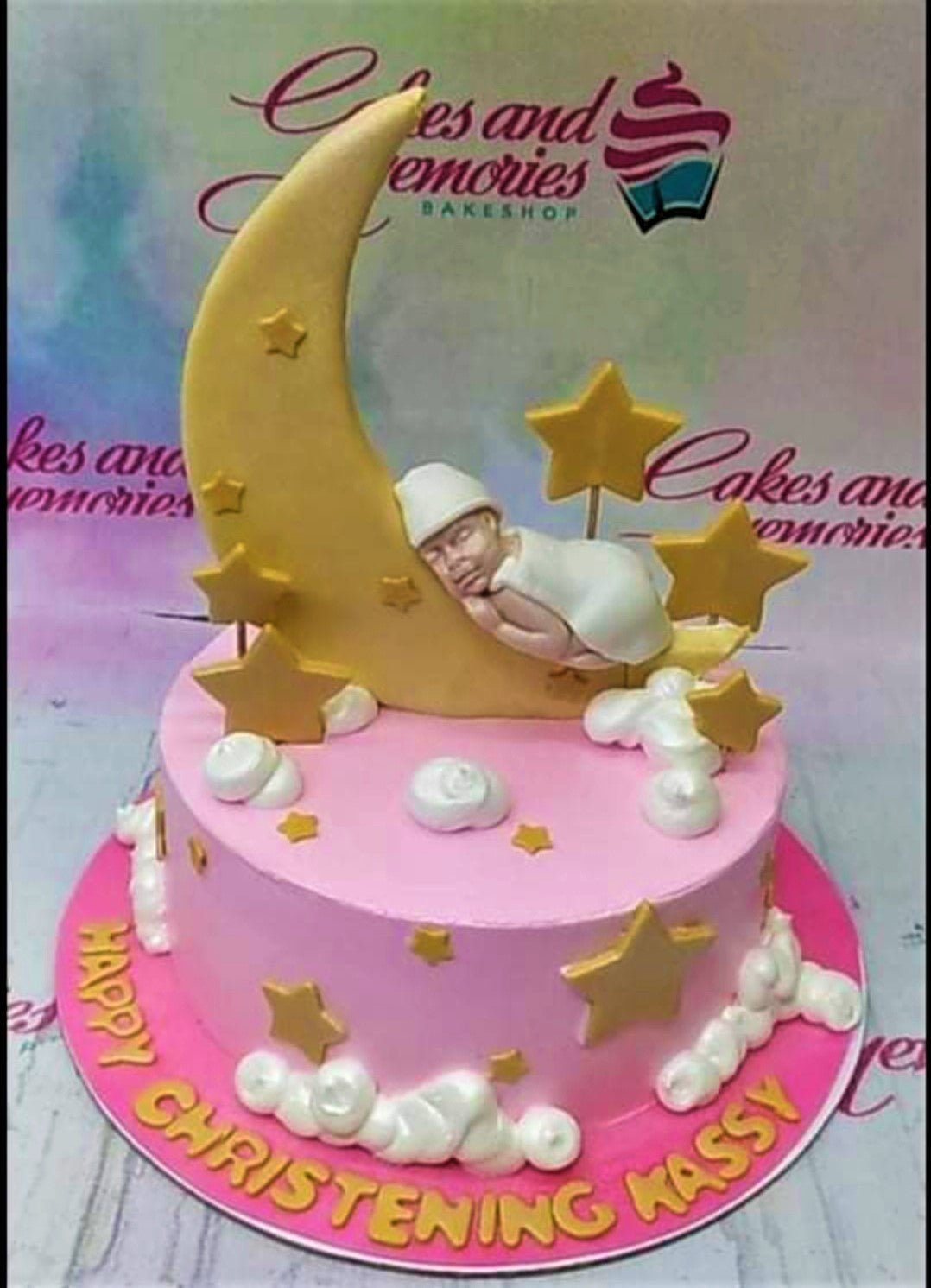 Pink christening cake with a sleeping baby on a gold crescent moon, gold stars, and white icing clouds.