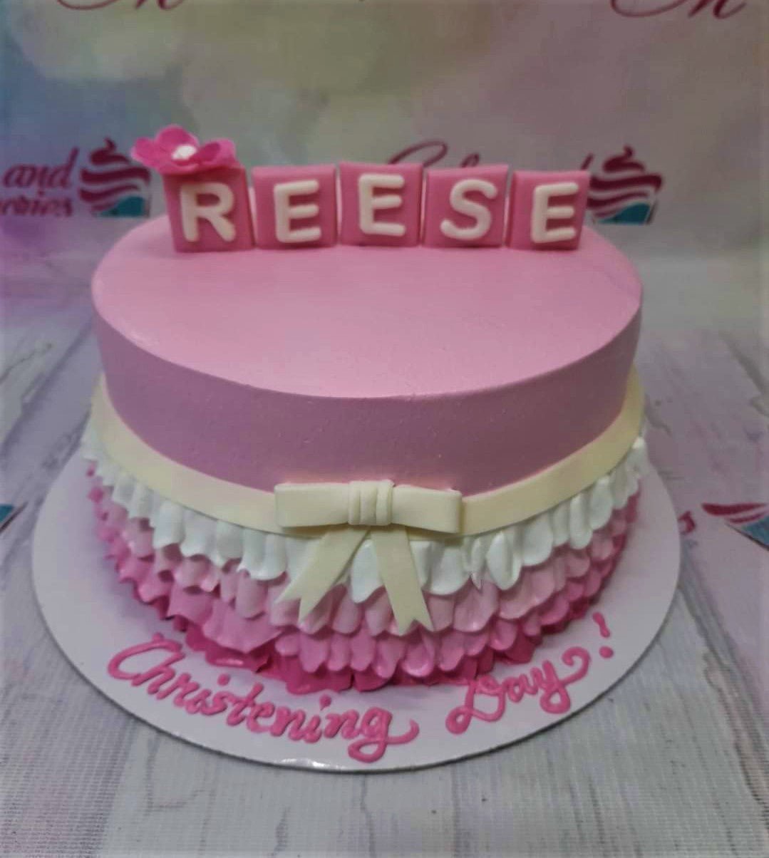 Pink 1-tier christening cake with pink and white icing ruffles, a cream bow, and pink letter blocks spelling REESE.
