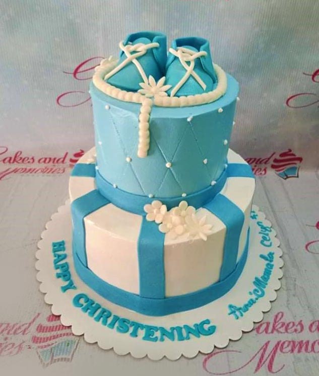 Two-tier blue and white christening cake with fondant baby shoes and a rosary topper.