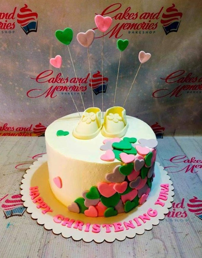White christening cake with a cascade of pink, green, and purple fondant hearts and yellow baby shoes on top.