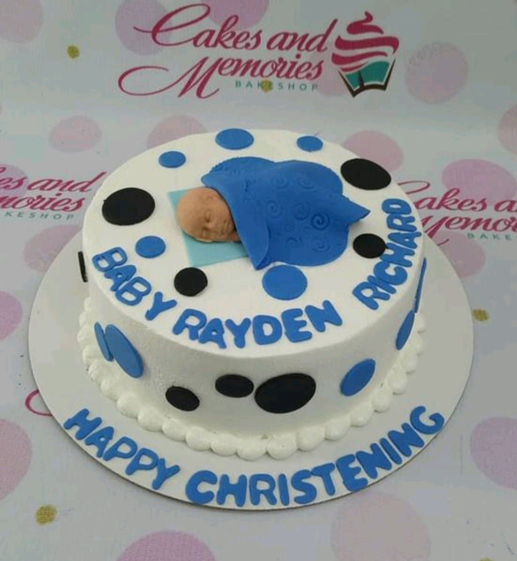 White round christening cake with a blue fondant sleeping baby topper and blue and black polka dots.