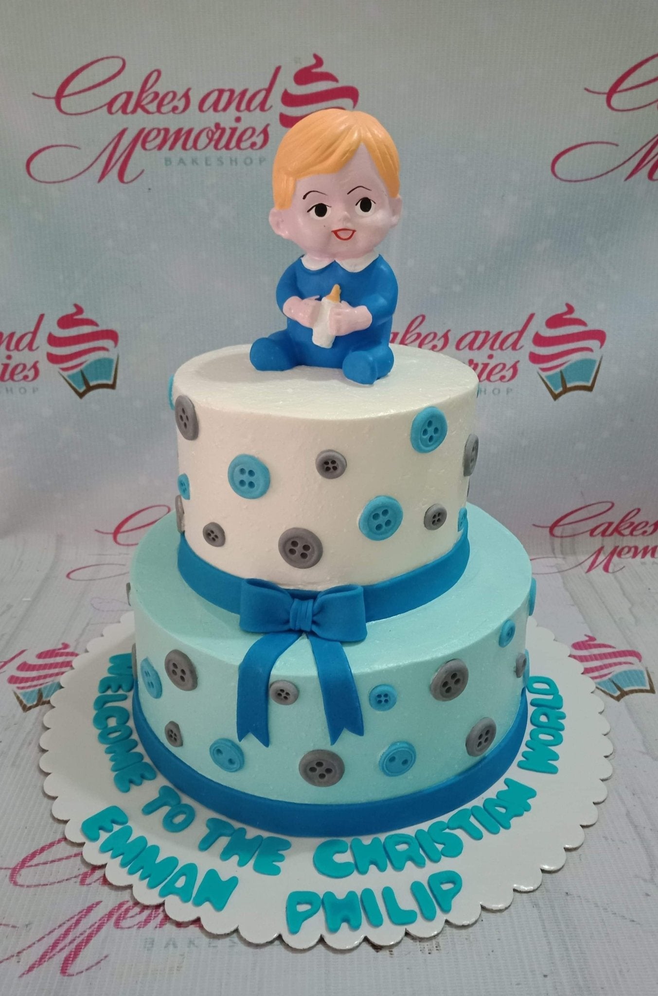 Two-tier blue and white christening cake with a baby boy topper and button decorations.