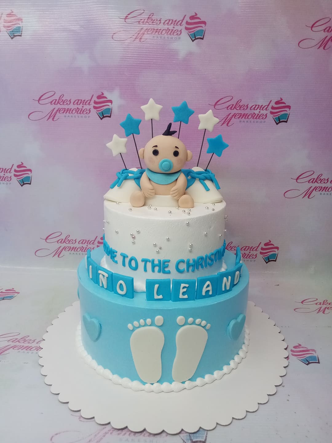 Two-tier blue and white christening cake with a fondant baby topper, stars, and silver dragees.