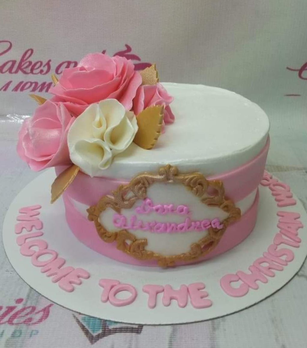 Pink and white striped cake with large pink and white gumpaste roses and a gold ornate frame message plaque.