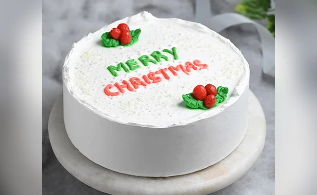 White minimalist Christmas cake with red and green icing holly decorations and Merry Christmas message