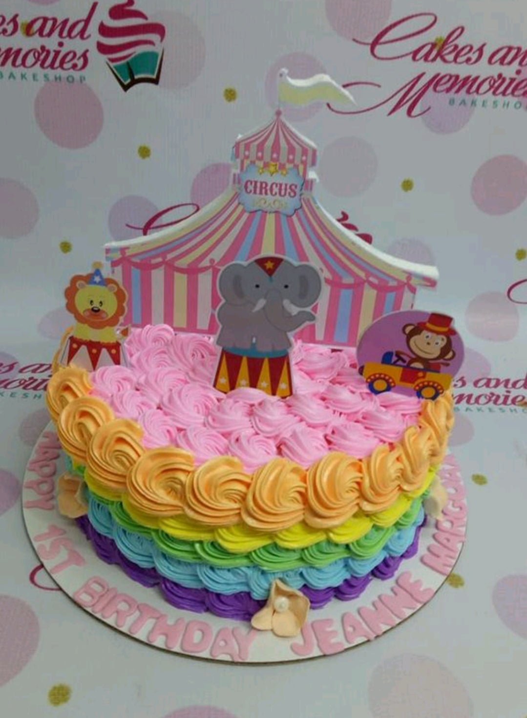 Rainbow circus themed birthday cake with pink, orange, yellow, green, blue, and purple icing ruffles and animal printout toppers.