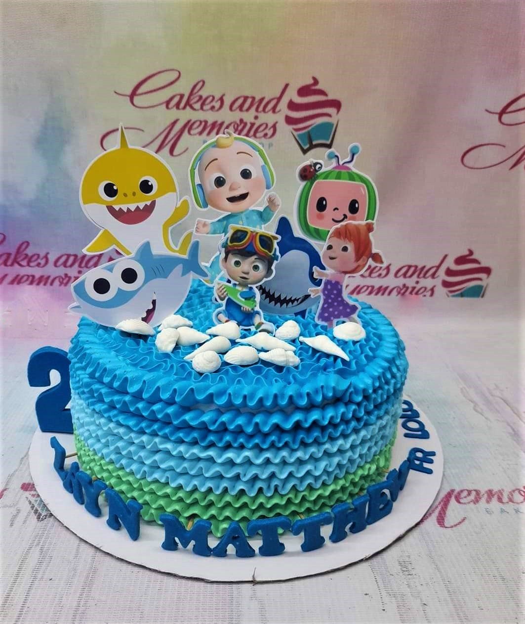 Blue and green ruffled icing Cocomelon and Baby Shark themed birthday cake with character printouts and white seashell decorations.