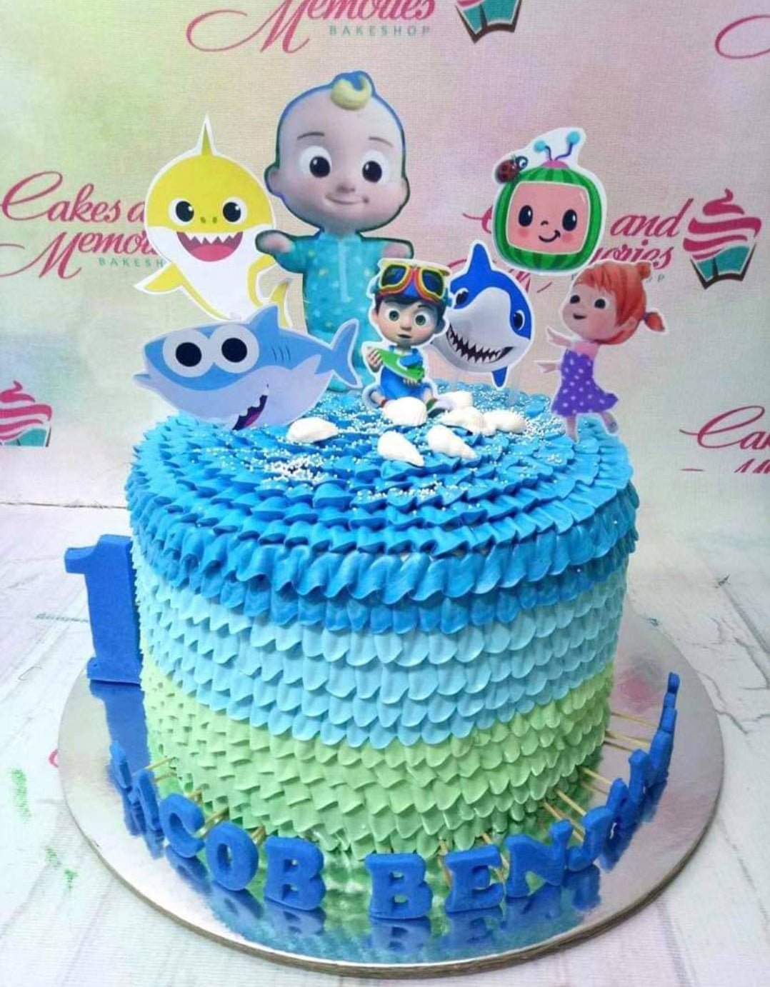 Cocomelon and Baby Shark themed birthday cake with blue and green ruffled icing and character printouts.