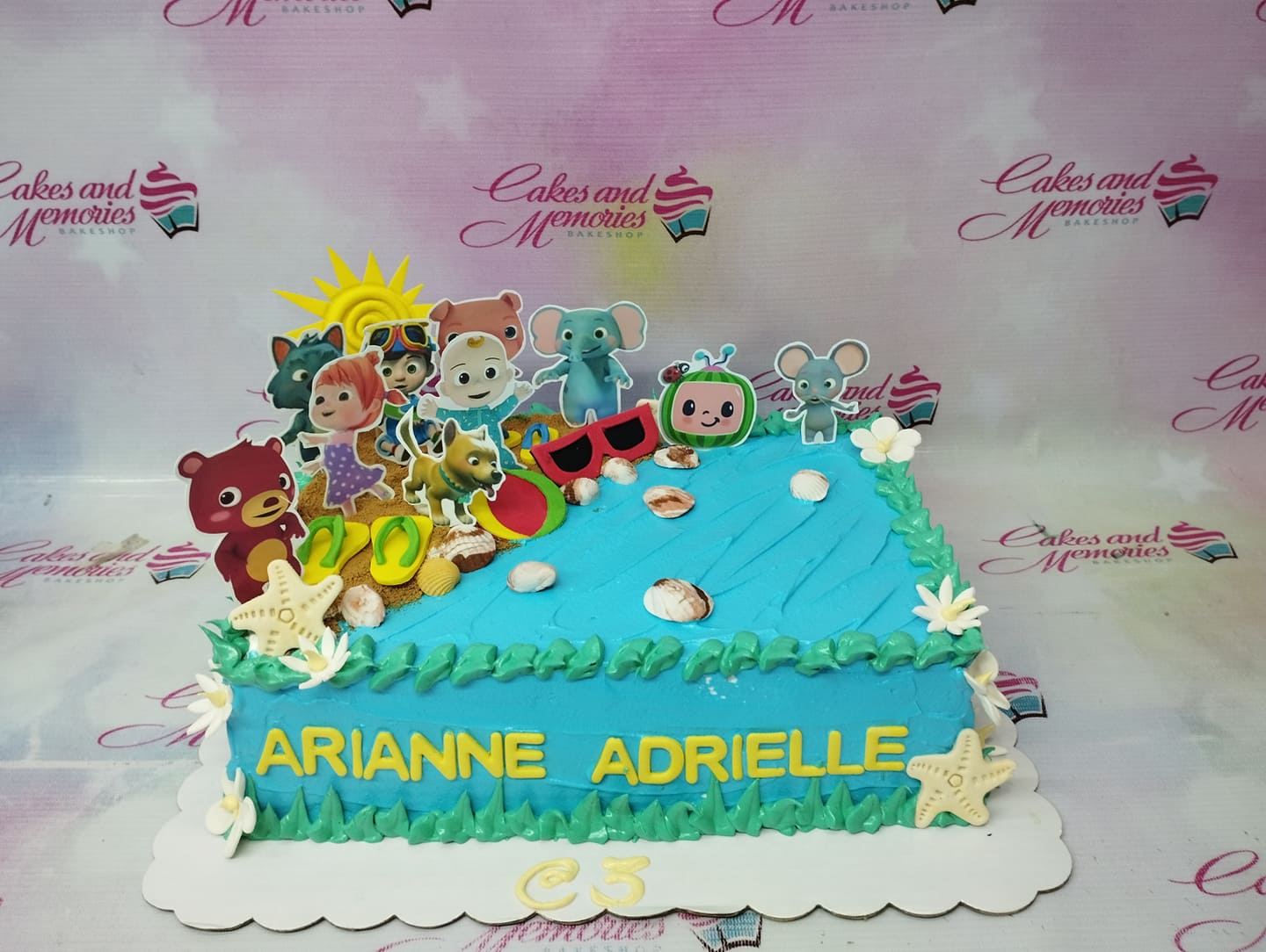 Cocomelon beach themed rectangle cake with blue icing waves, sand texture, and character printouts including JJ and friends.