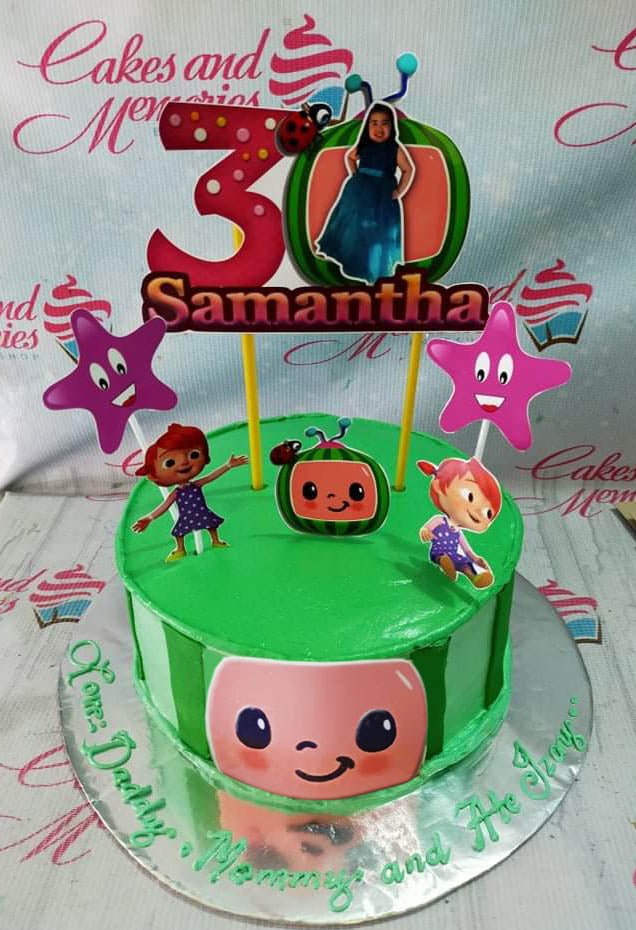 Cocomelon themed green watermelon cake with character printouts and a large number 30 topper for Samantha.