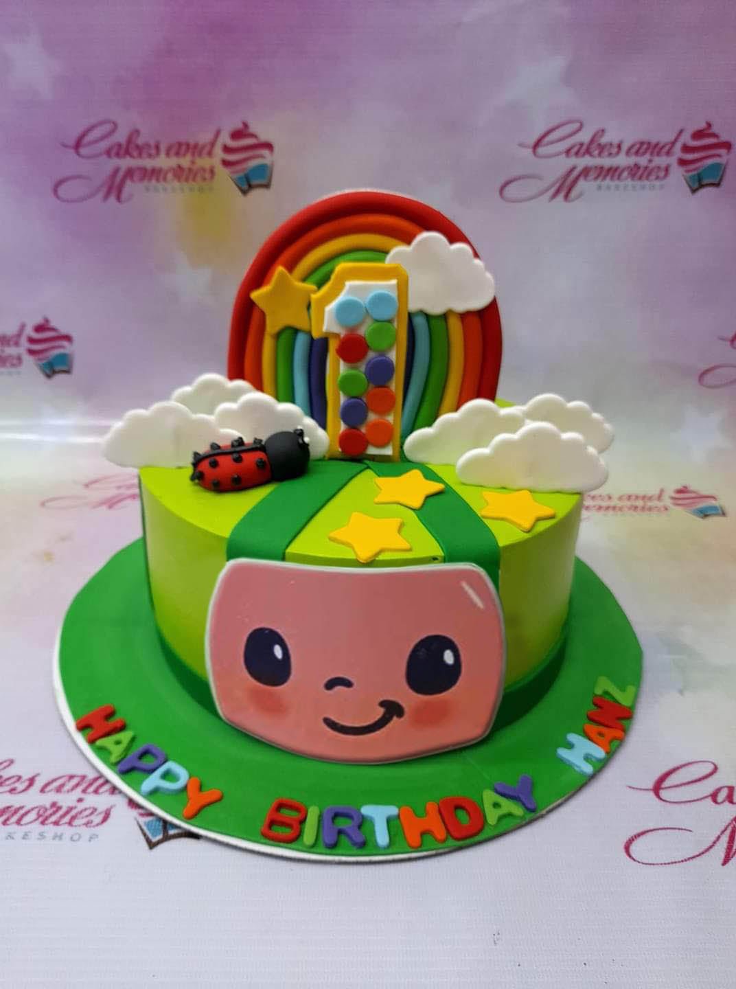 Cocomelon themed birthday cake with a green striped base, a large Cocomelon face, a rainbow topper, and a ladybug.