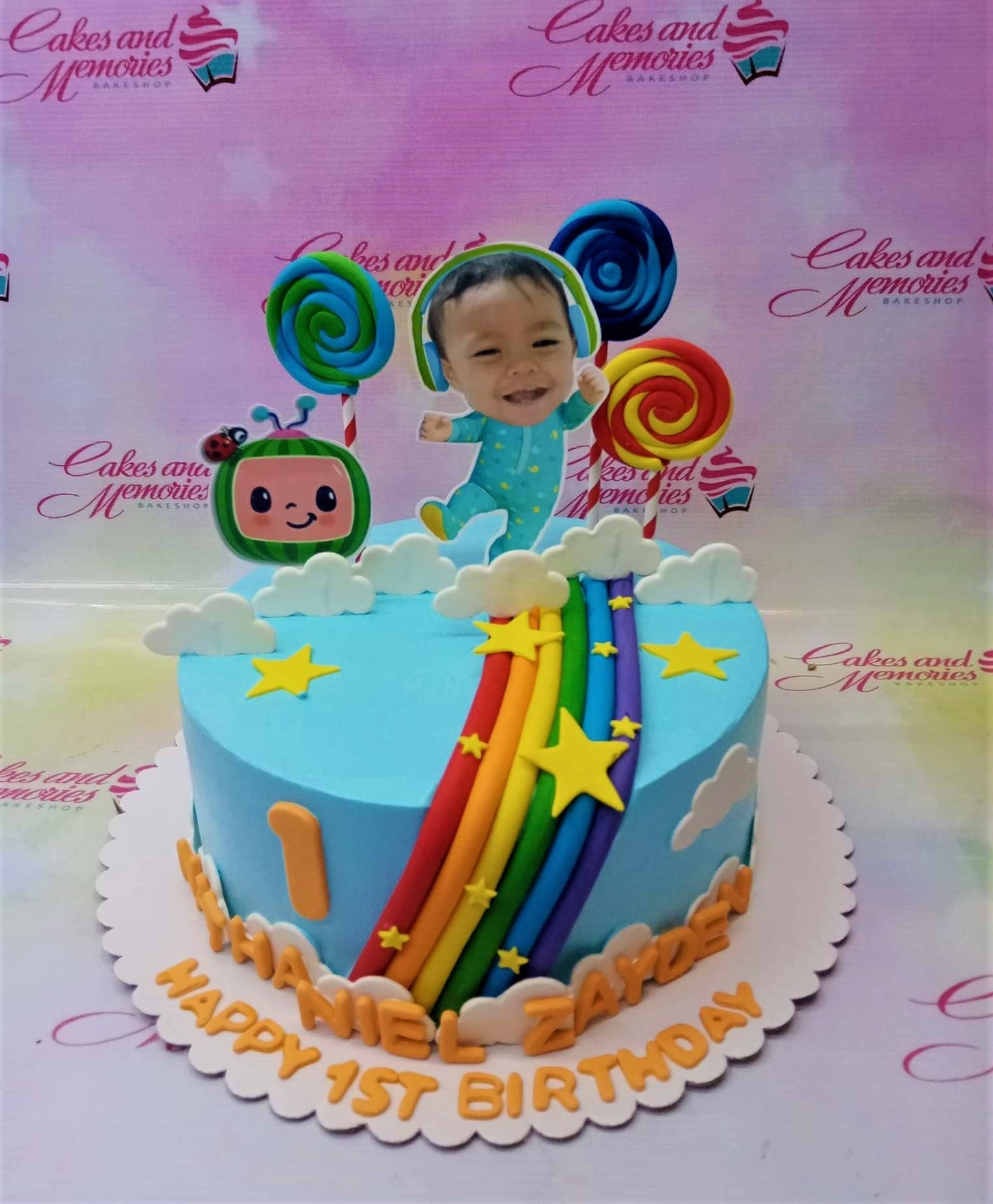 Light blue Cocomelon themed birthday cake with a rainbow, clouds, stars, and a personalized photo topper of a baby.