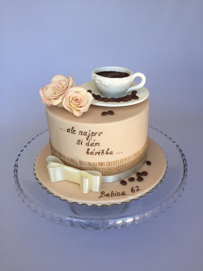 A cream 1 tier cake featuring a coffee cup and saucer, peach roses, coffee beans, and a burlap wrap.