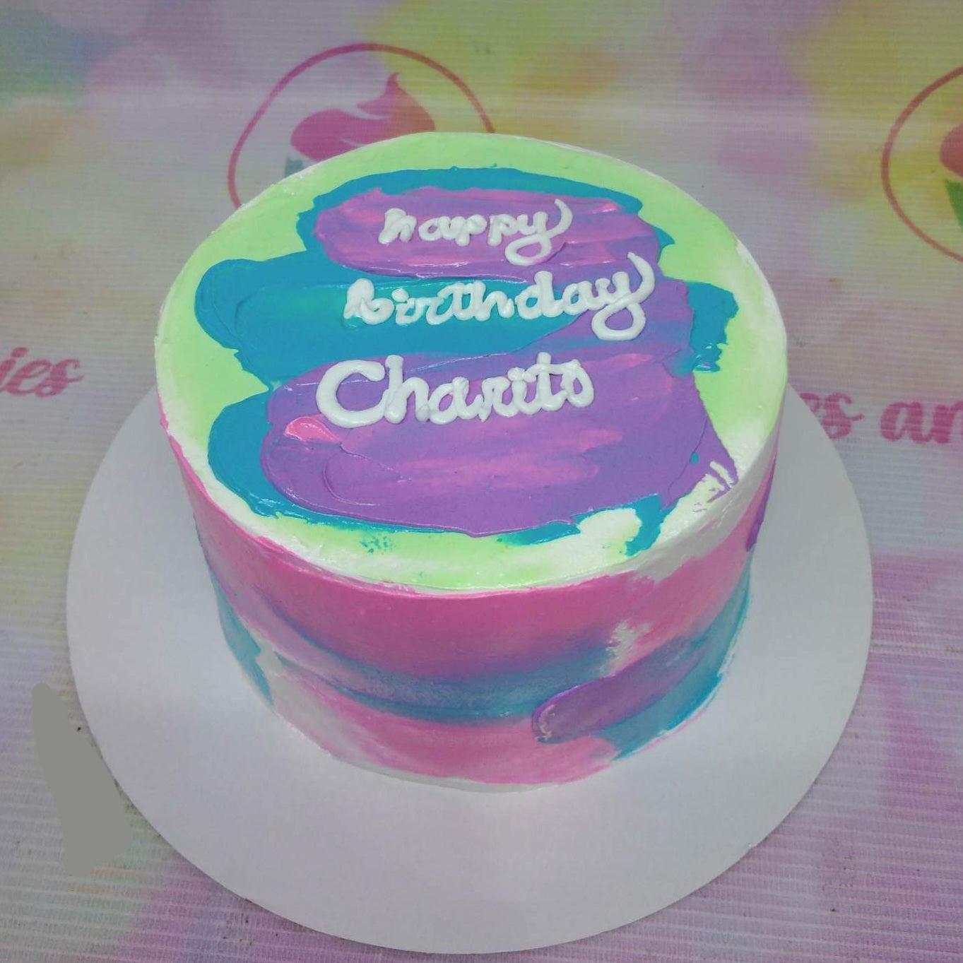 This vibrant Bento cake is the perfect choice for a colorful birthday celebration. The design features an artistic palette knife icing technique with bold strokes of pink, blue, purple, and light green. A clean white icing message on top reads 'Happy Birthday Charito' in a charming script. This personalized mini cake is ideal for intimate celebrations or as a thoughtful gift for a loved one. Its unique abstract design makes every slice a piece of art for your special day. Order your custom bento cakes today through Genie.ph for delivery in Cebu City, Mandaue, and Lapu-lapu City.