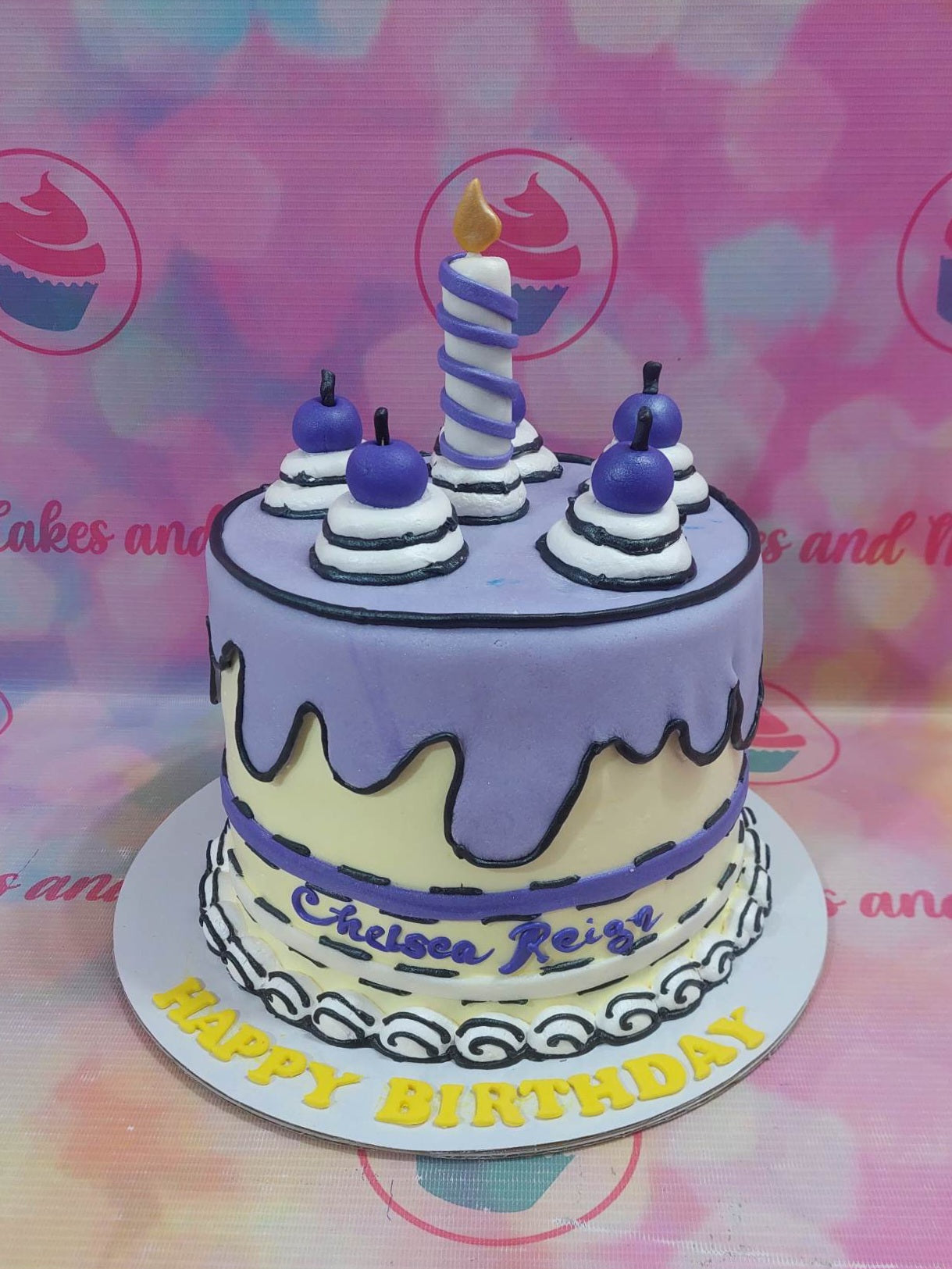 Purple and white 2D comic style cake with a large fondant candle and cherry toppers