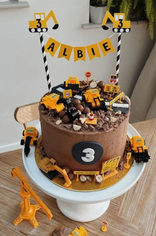Chocolate construction themed birthday cake with toy excavators, road signs, and a banner for Albie's 3rd birthday.