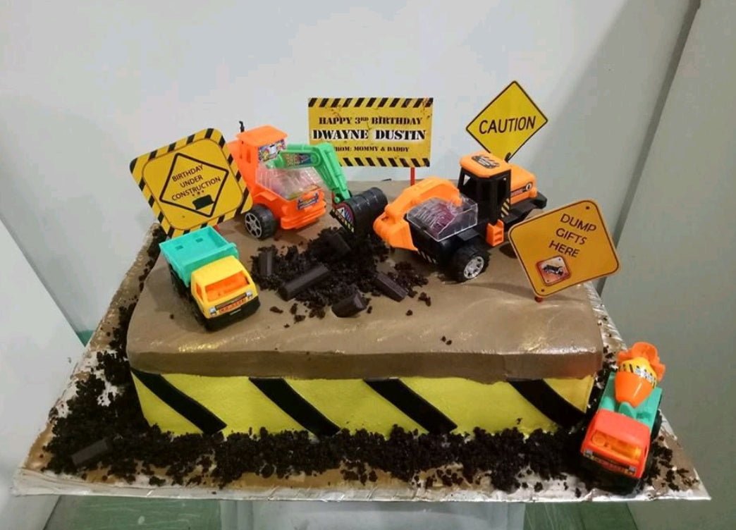 Construction themed rectangle cake with yellow and black hazard stripes, brown icing, and toy construction vehicles like excavators and dump trucks.