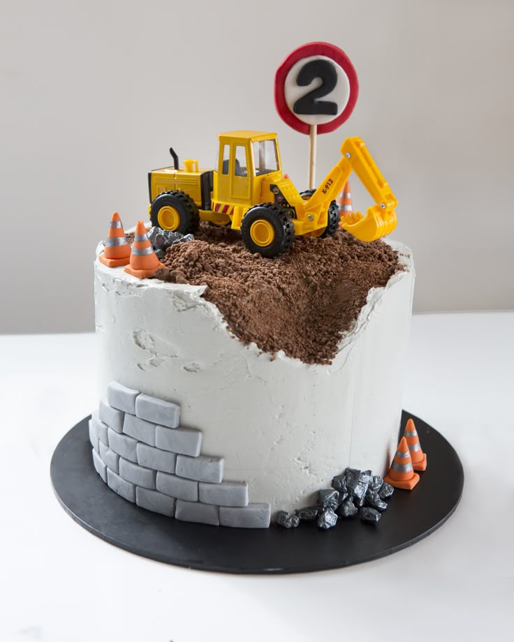 Construction themed birthday cake with a yellow excavator toy on top of edible chocolate soil and grey fondant brick wall details.