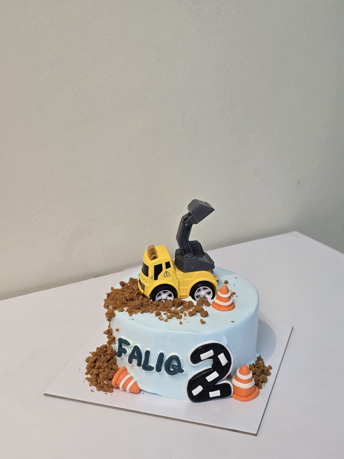 Light blue construction themed cake with a yellow toy excavator, orange traffic cones, and edible chocolate soil for a 2nd birthday.