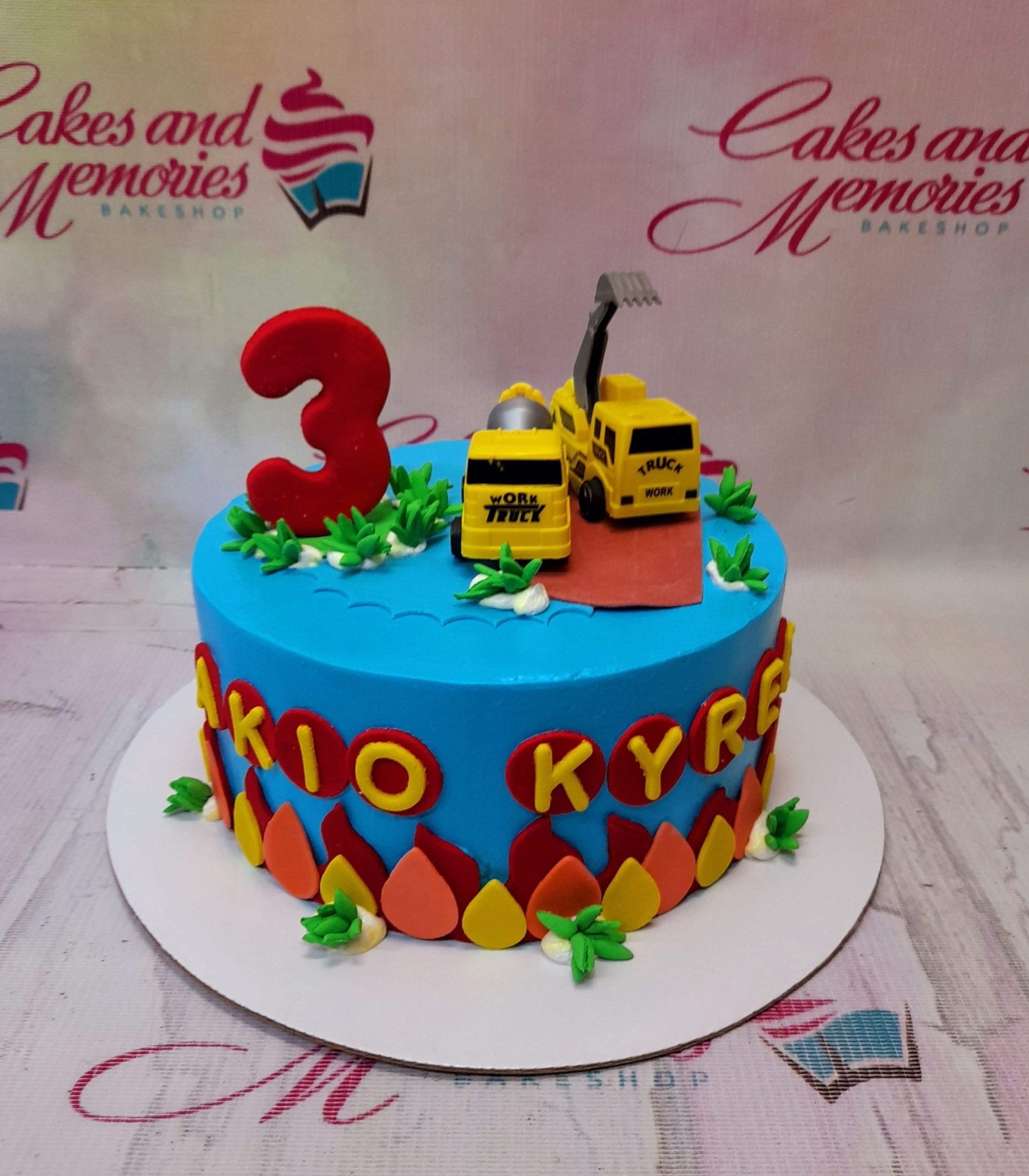 Blue construction themed birthday cake with yellow toy trucks, a red number 3 topper, and fondant flames around the base.