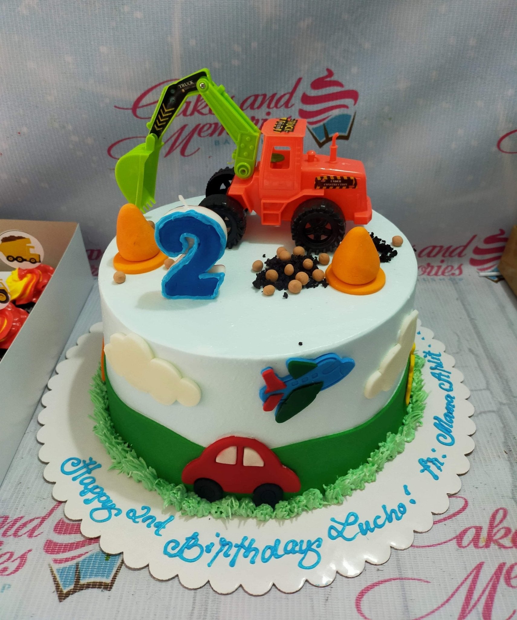 Construction themed birthday cake with a large orange excavator toy, orange cones, and a blue number 2 candle on light blue icing.