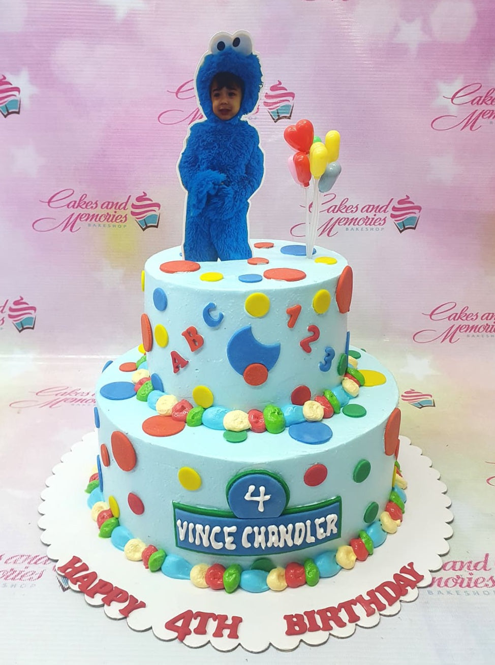 Light blue 2-tier Sesame Street themed birthday cake with Cookie Monster printout and colorful fondant dots and numbers.