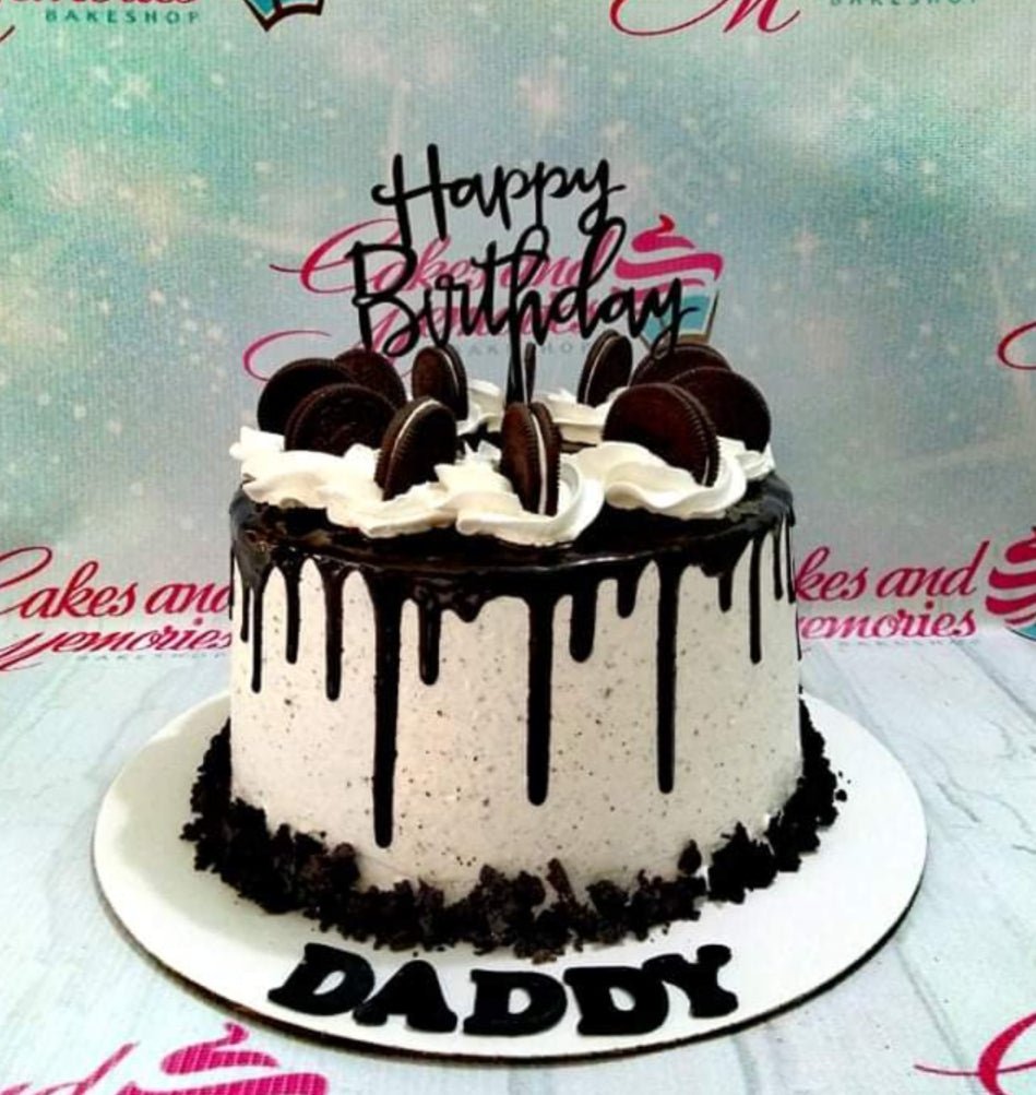 Cookies and cream birthday cake with chocolate drip, white icing swirls, and Oreo cookies on top for Daddy.