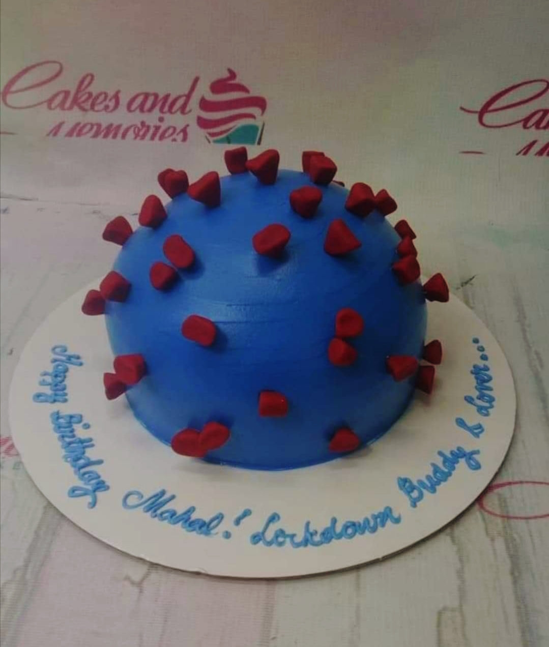 Blue dome-shaped coronavirus themed cake with red fondant spikes and a birthday message on the base board.