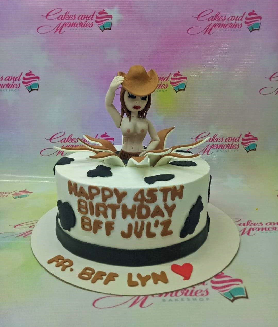 Cow print birthday cake with a 3D fondant cowgirl figure popping out of the top and brown icing text.