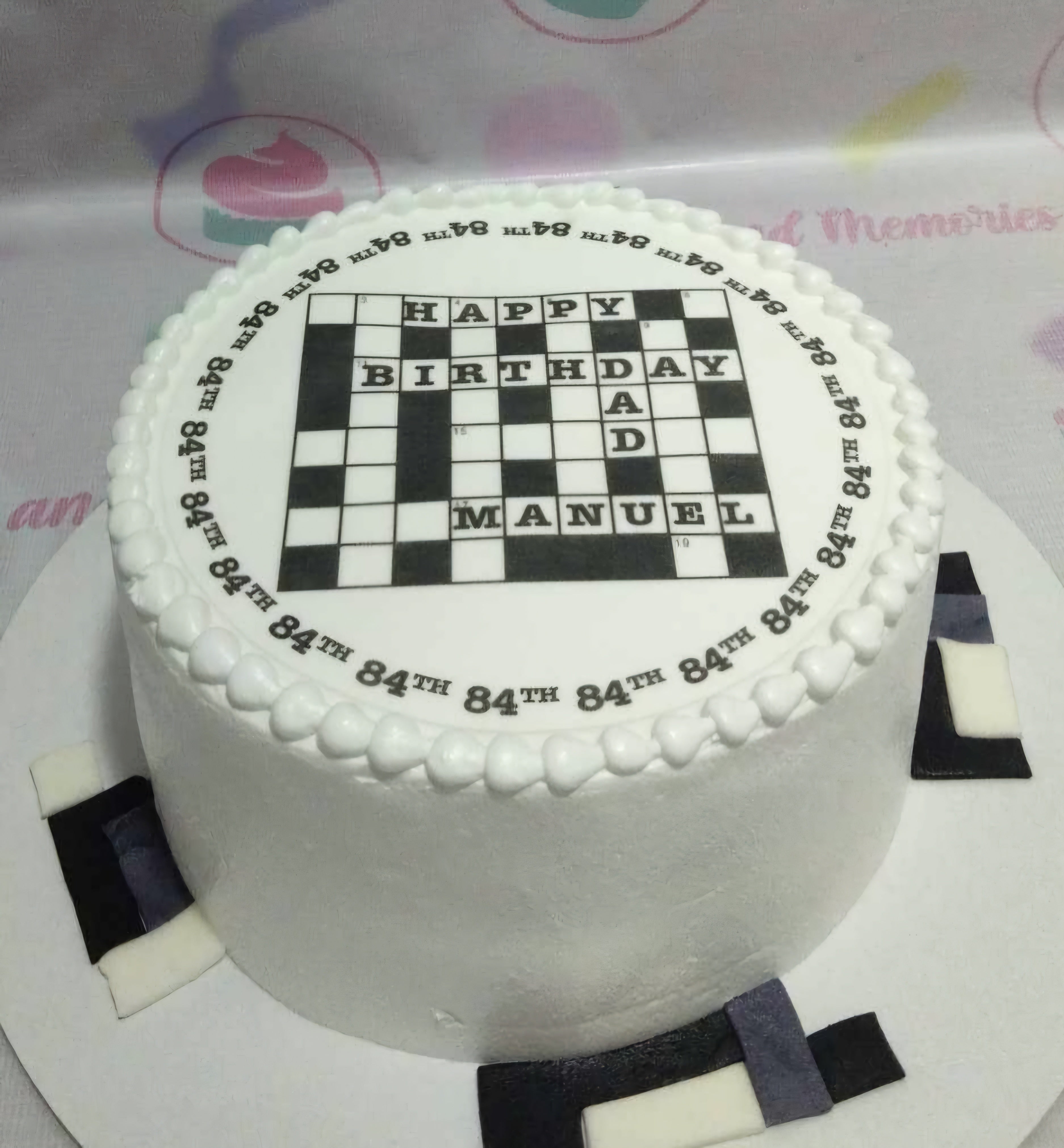 White minimalist birthday cake for Dad Manuel featuring a crossword puzzle design and 84th birthday border.