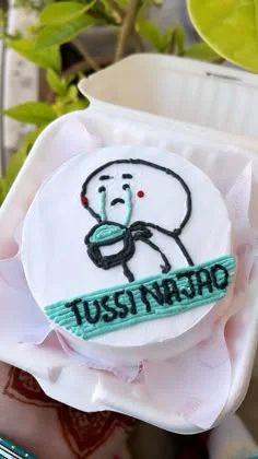 White bento cake with a hand-drawn crying character holding a cup and the message TUSSI NA JAO in black icing on a teal border.