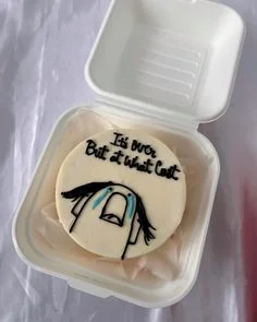 White bento cake with a hand-drawn crying meme character and the message 'It's over But at what Cost' in black icing.