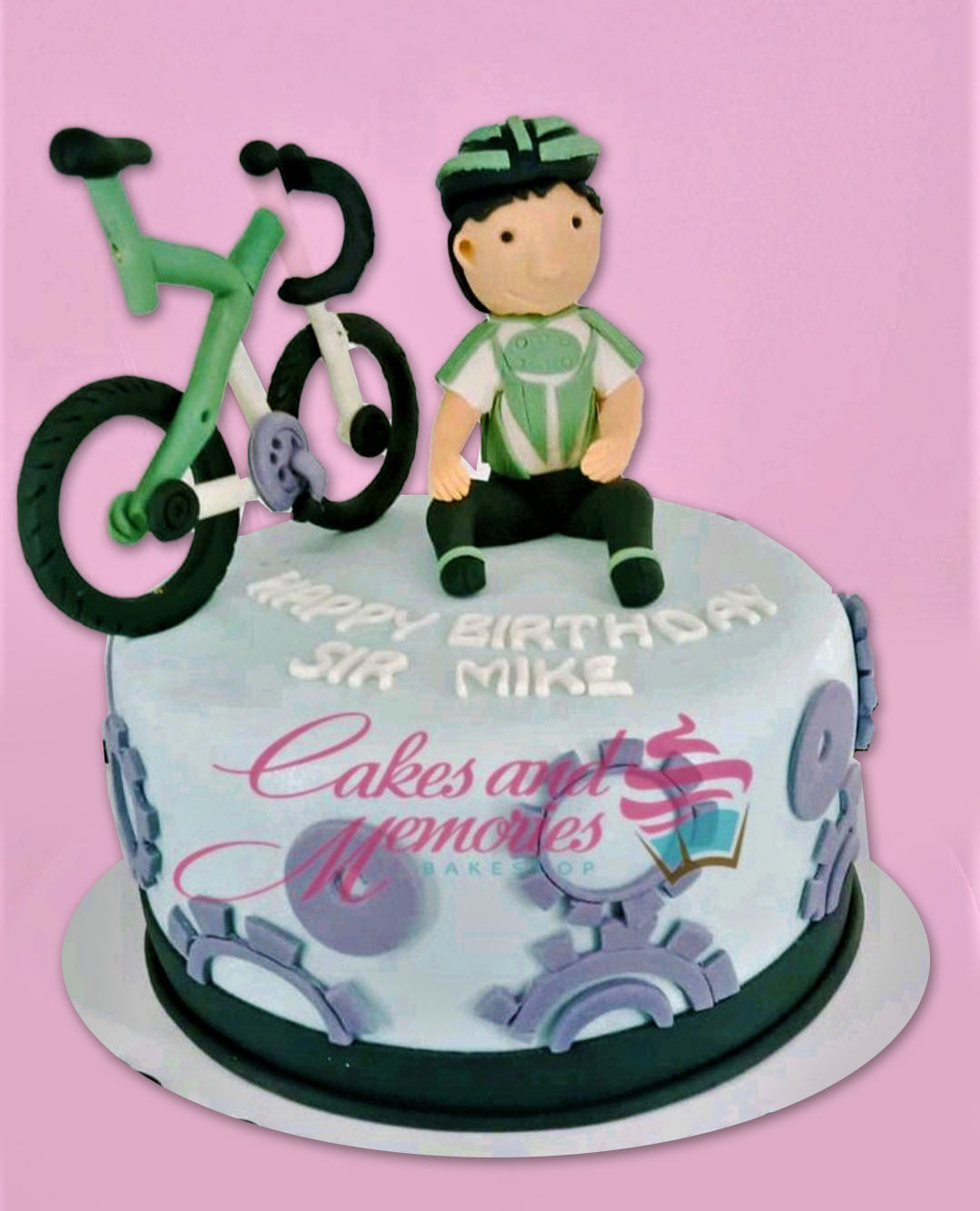 Light blue fondant cake for a cyclist featuring a 3D fondant biker figure, a green bicycle, and purple gear decorations.