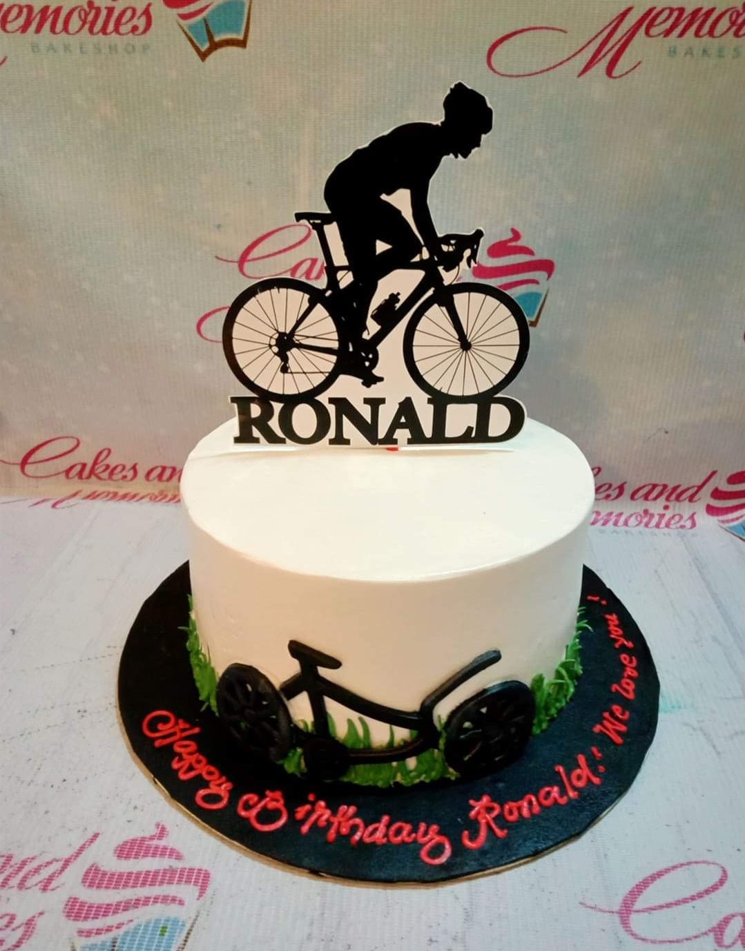 White minimalist birthday cake with a black cyclist silhouette topper and a 3D bicycle decoration at the base.