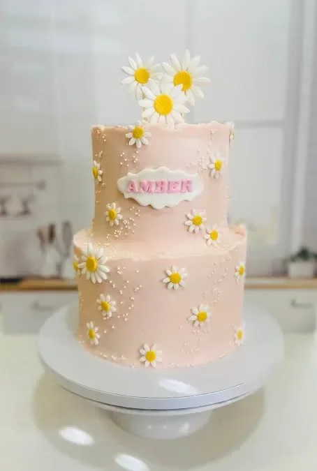 Two-tier peach minimalist cake decorated with white and yellow fondant daisies and a pink name plaque for Amber.