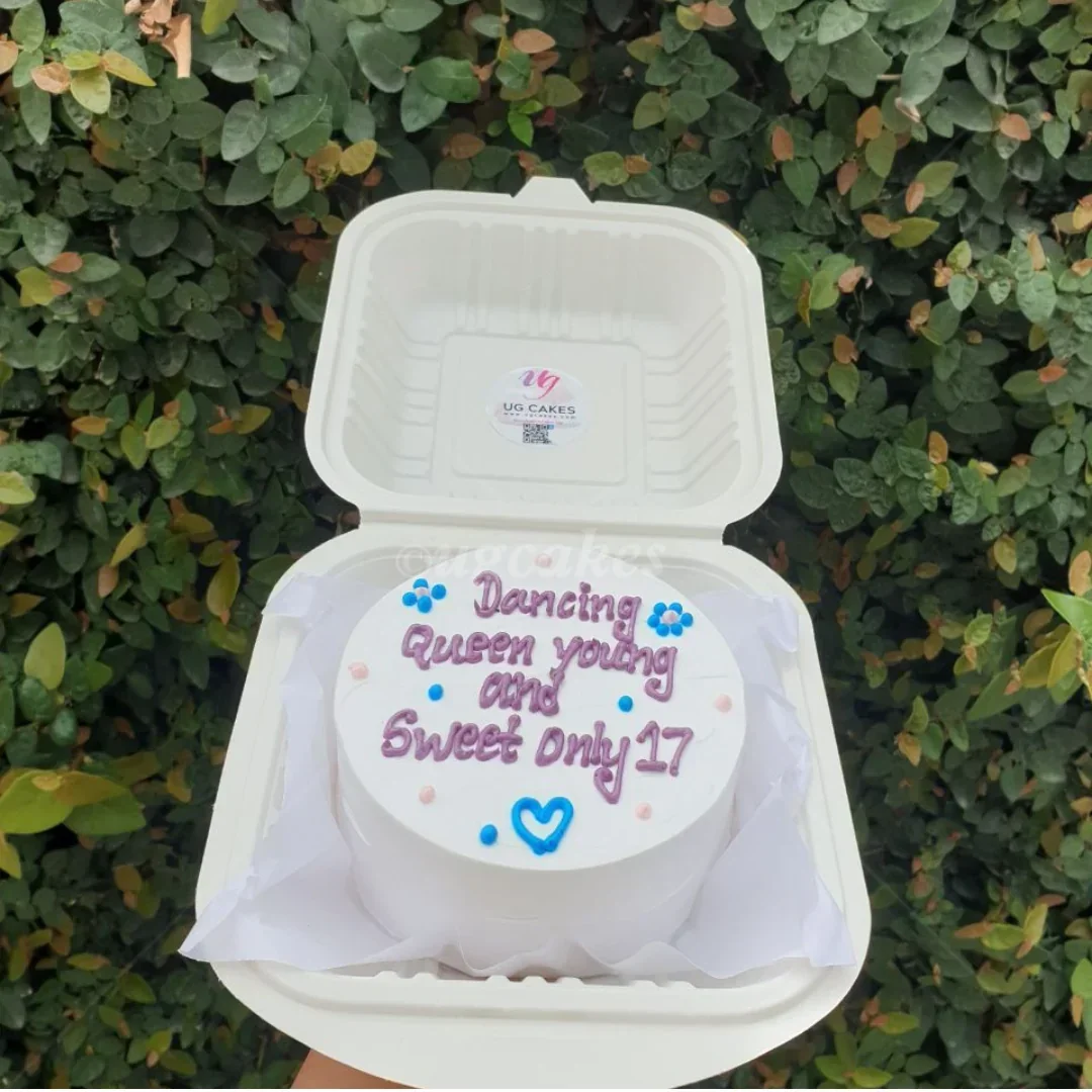 White bento cake with purple piped message 'Dancing Queen young and sweet only 17' and blue icing heart and flowers.