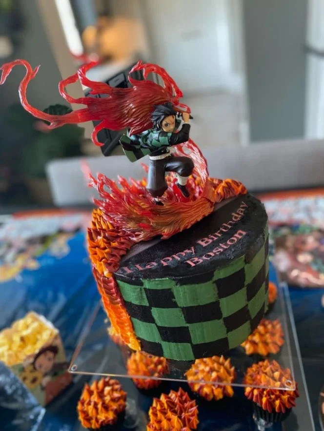 Demon Slayer Tanjiro Kamado themed cake with black and green checkered icing and a large 3D character figure with fire effects.