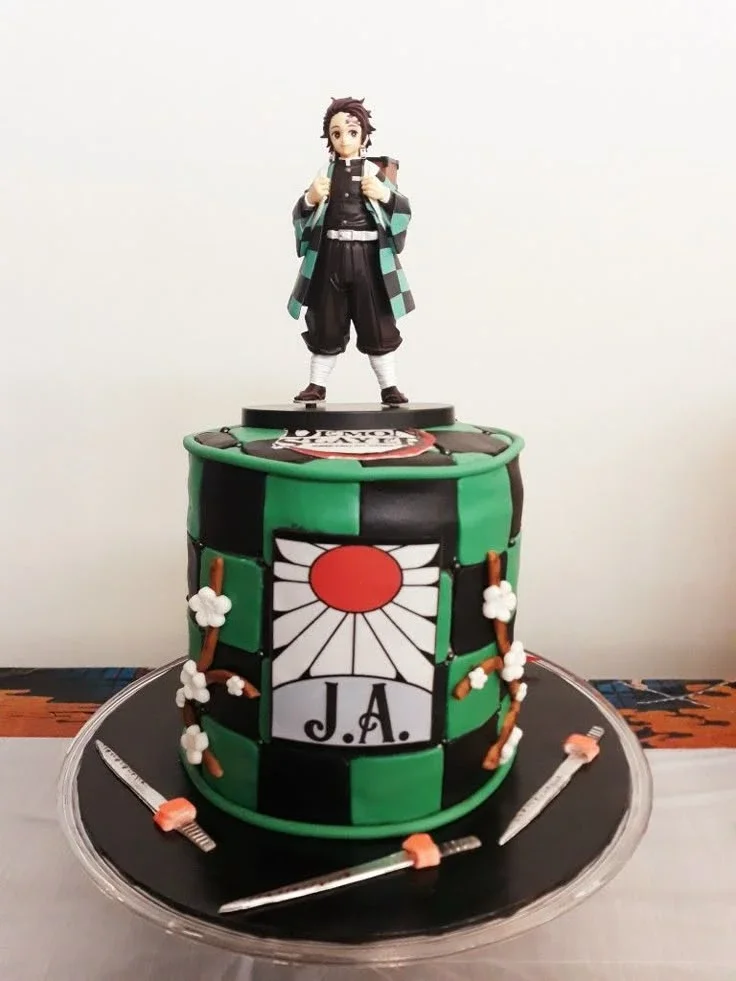 Demon Slayer Tanjiro Kamado themed fondant cake with green and black checkered pattern and katana sword toppers.