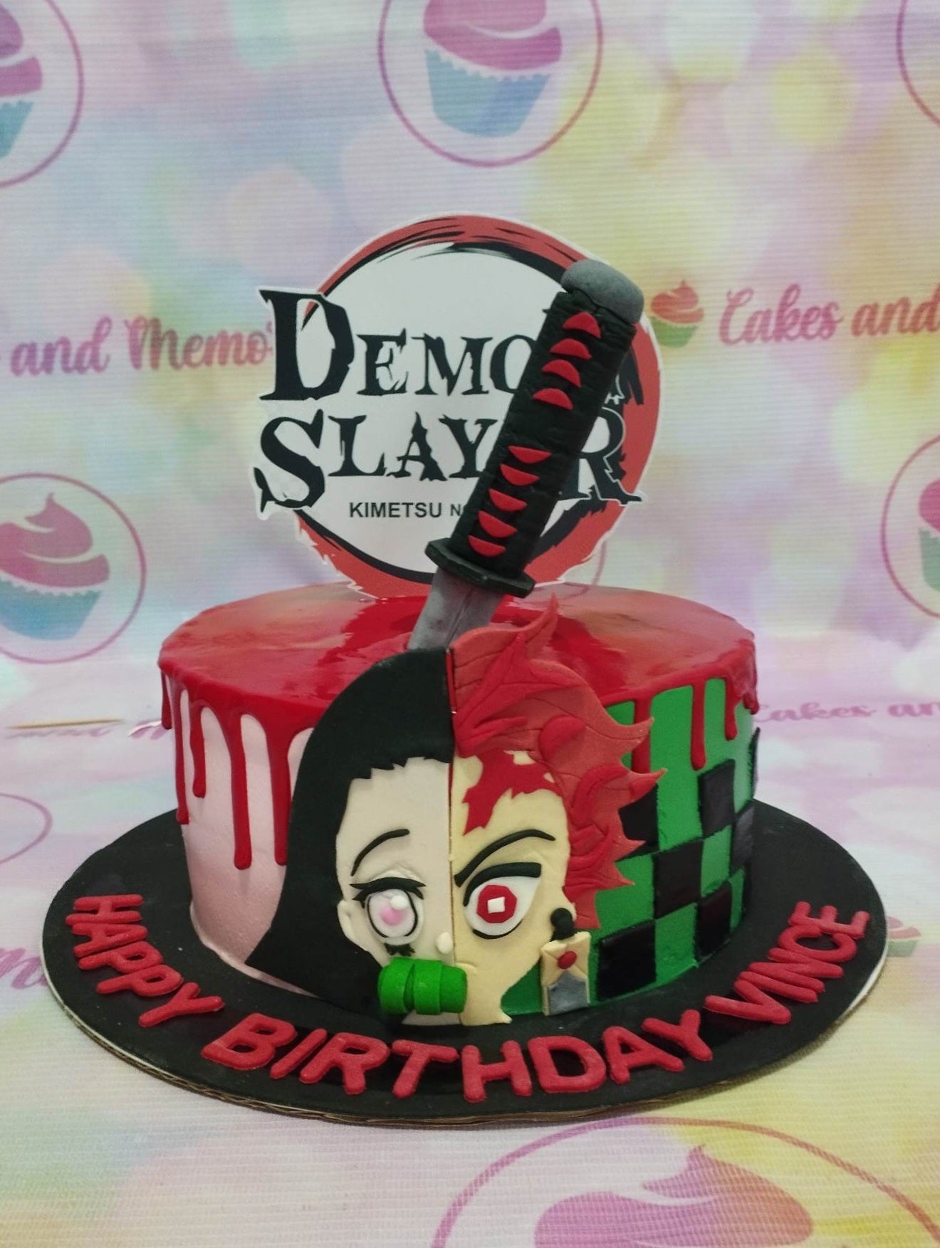 Demon Slayer themed birthday cake with Tanjiro and Nezuko split face design, red drip, and a sword topper.