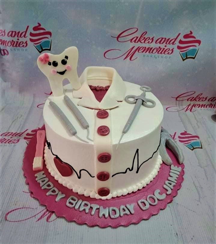 White dentist themed birthday cake with a fondant tooth character, medical tools, and a doctor's coat design on a pink base board.