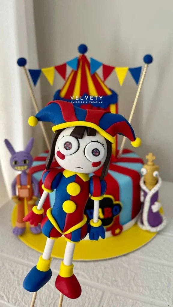 The Amazing Digital Circus themed cake featuring Pomni, Jax, and Kinger fondant figures with a circus tent backdrop.