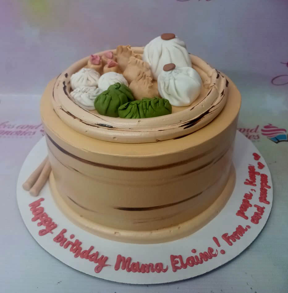 Dim sum themed birthday cake designed as a bamboo steamer basket with fondant dumplings and buns on top.
