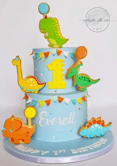 Two-tier light blue dinosaur birthday cake with colorful dinosaur cookies, bunting banners, and a yellow number one topper.