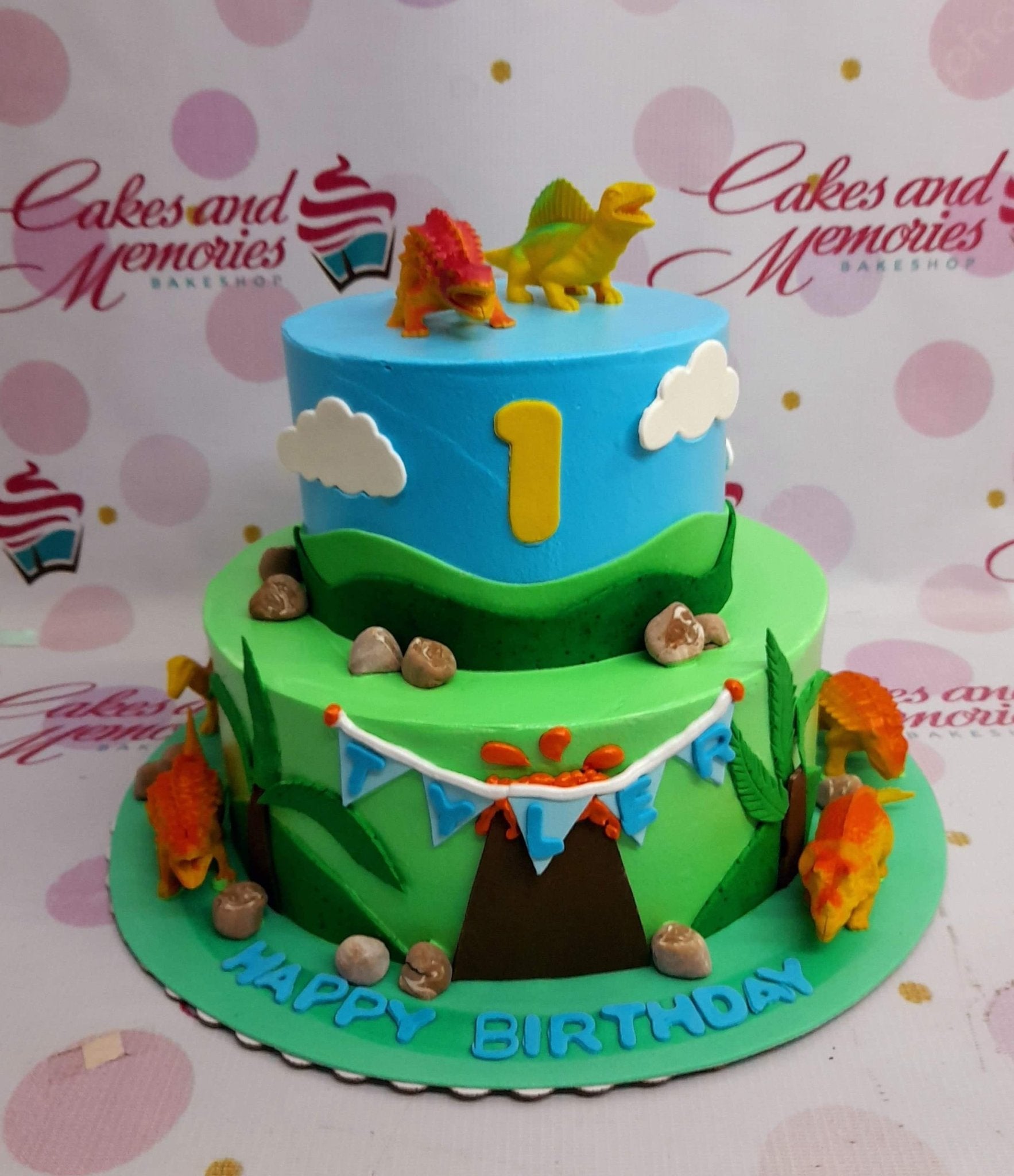 Two-tier dinosaur themed birthday cake with blue and green fondant, toy dinosaurs, and a volcano decoration.