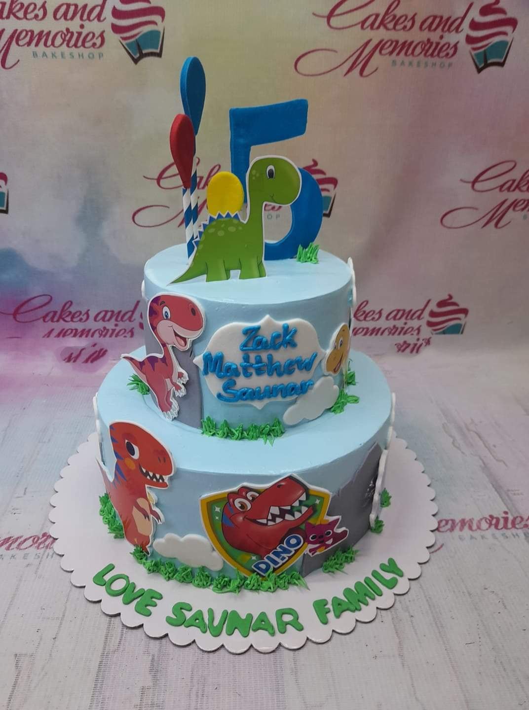 Two-tier light blue dinosaur themed birthday cake with colorful dinosaur printouts and a large blue number five topper.
