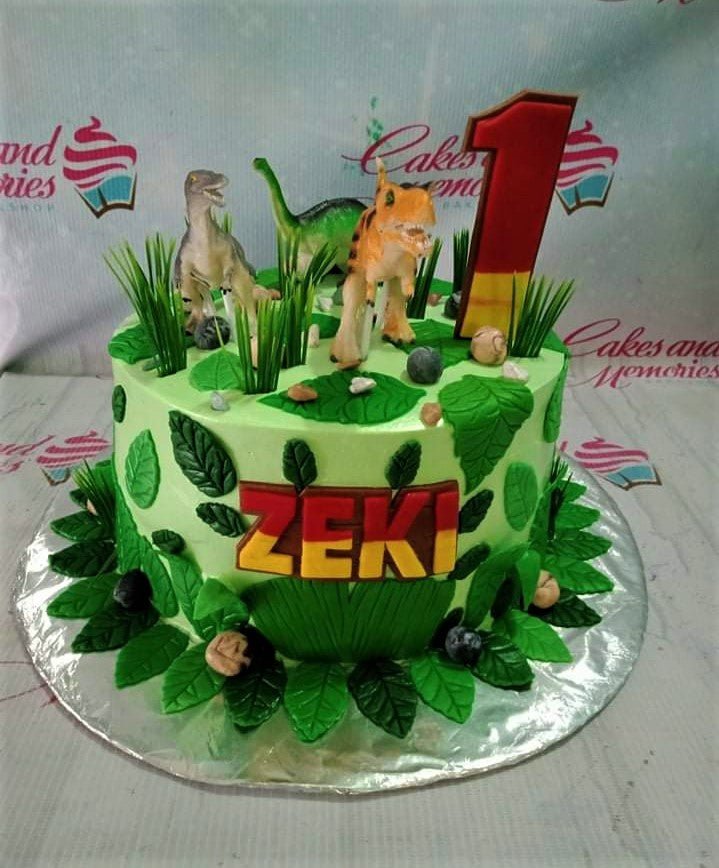 Dinosaur themed birthday cake with green icing, fondant leaves, and 3D dinosaur figures for Zeki's 1st birthday.